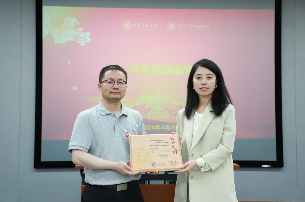 仪式上,毛珊代表教育基金会与鄢超波校友签署捐赠协议,并为校友代表鄢超波颁发捐赠纪念铭牌;赵立波代表学校向21位校友:鄢超波、任娟、徐敏、杨爽、陈俊刚、邓凤军、杜树安、高辉、靳慧杰、鞠涛、李昕、刘大巍、马海壮、秦炼、王双庆、王涛、王学平、吴价梁、谢珏、余海明、张兆康赠送纪念品。