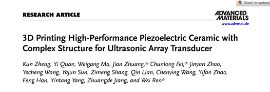 蒋庄德院士团队与西安电子科技大学杨银堂教授团队提出了基于3D打印技术的“压电材料-复杂结构-器件应用”全链条设计策略(图1),成功利用数字光处理技术(DLP)制造了高性能Sm掺杂PMN-PT(Sm-PMN-PT)压电陶瓷,实现了复杂几何结构成形,并在超声换能器应用上凸显了优势。优化粉末粒径后,固化性能显著提升,打印陶瓷压电系数d₃₃高达1285 pC/N,进一步设计并制备了传统方法难以实现的8元环形阵列超声换能器,展现60%大带宽、952 mV峰峰值电压及优异的成像分辨率。该成果有望为应用于医疗诊断和无损检测领域的压电器件定制化设计开辟新途径。